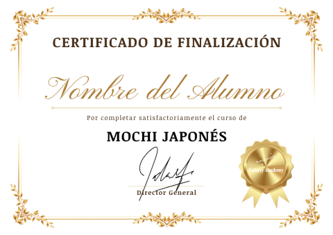 Diseñado con estilo profesional, este certificado valida que completaste el programa y adquiriste habilidades auténticas en técnicas japonesas, rellenos, decoraciones y recetas especializadas. Perfecto para añadir a tu portafolio, reforzar la confianza de tus clientes o demostrar tu crecimiento personal. Un documento elegante y valioso que celebra tu esfuerzo y te impulsa a seguir avanzando en tu camino culinario.